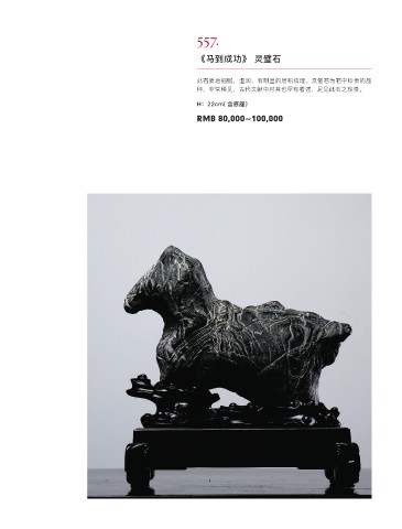 557. 《马到成功》 灵璧石 此石质地细腻,温润,有明显的层积纹理。灵璧石为石中珍贵的品 种,非常稀见,古代文献中对其也罕有着述,足见此石之珍贵。 H:22cm( 含底座) RMB 80,000~100,000