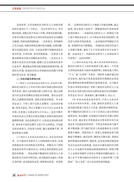 素。由于新的社会阶层人士的构成较为复杂,从而 政的渠道还比较狭窄,制度化、法治化参政议政还没