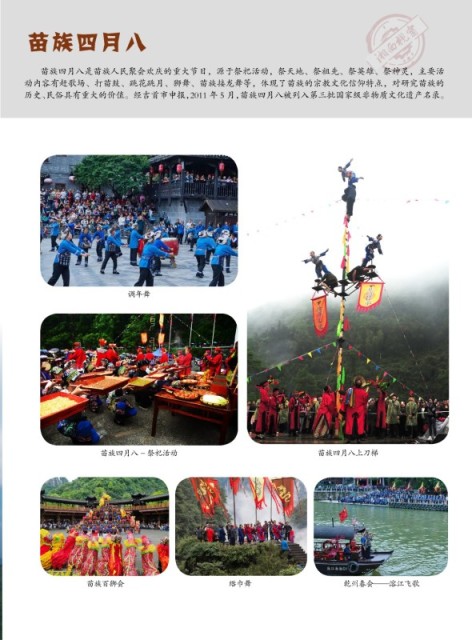 苗族四月八 苗族四月八是苗族人民聚会欢庆的重大节日,源于祭祀活动,祭天地、祭祖先、祭英雄、祭神灵,主要活 动内容有赶歌场、打苗鼓、跳花跳月、狮舞、苗族接龙舞等,体现了苗族的宗教文化信仰特点,对研究苗族的 历史、民俗具有重大的价值。经吉首市申报,2011 年 5 月,苗族四月八被列入第三批国家级非物质文化遗产名录。 调年舞 苗族四月八 - 祭祀活动 苗族四月八上刀梯 苗族百狮会 绺巾舞 乾州春会——溶江飞歌