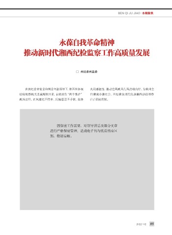 BEN QI JU JIAO·本期聚焦 永葆自我革命精神 推动新时代湘西纪检监察工作高质量发展 □ 州纪委州监委 在省纪委省监委和州委坚强领导下,湘西州各级 大局勇担当,推动党风政风行风持续向好,为我州全 纪检监察机关忠诚履职尽责,自觉担负“两个维护” 面建成小康社会、开启建设现代化新湘西新征程作 政治责任,正风肃纪不停步、反腐惩恶不手软、服务 出了积极贡献。 因保密工作需要,对领导讲话及部分文章 进行严格保密管理,造成电子刊与纸质档有区 别,敬请谅解。 2022 • 02 05