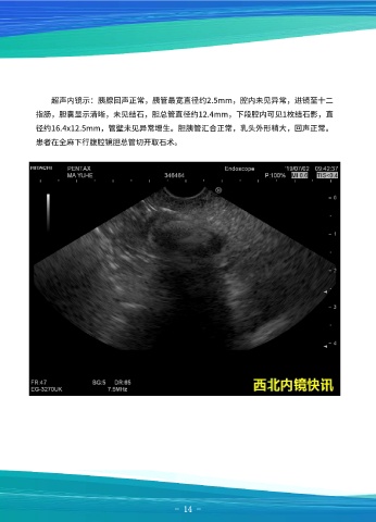 指肠,胆囊显示清晰,未见结石,胆总管直径约12.4mm,下段腔内可见1枚结石影,直                                       胆道梗阻。