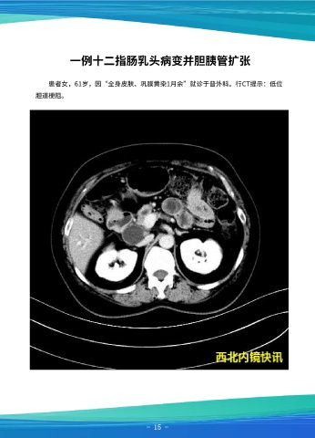 一例十二指肠乳头病变并胆胰管扩张 超声内镜示:胰腺回声正常,胰管最宽直径约2.5mm,腔内未见异常,进镜至十二 患者女,61岁,因“全身皮肤、巩膜黄染1月余”就诊于普外科。行CT提示:低位 指肠,胆囊显示清晰,未见结石,胆总管直径约12.4mm,下段腔内可见1枚结石影,直 胆道梗阻。 径约16.4x12.5mm,管壁未见异常增生。胆胰管汇合正常,乳头外形稍大,回声正常。 患者在全麻下行腹腔镜胆总管切开取石术。 - 14 - - 14 - - - 15 - 15 -
