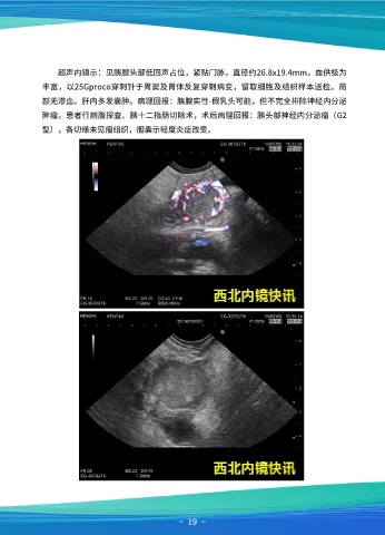 一例胰腺头部神经内分泌肿瘤 超声内镜示:见胰腺头部低回声占位,紧贴门脉,直径约26.8x19.4mm,血供极为
