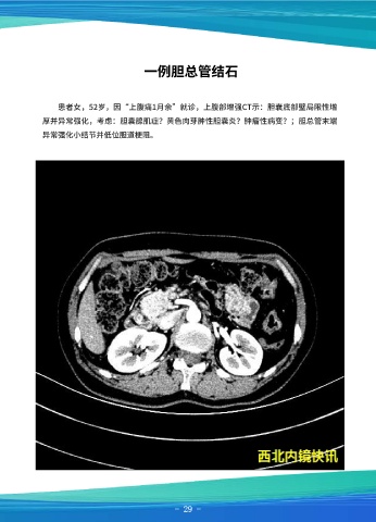 一例胆总管结石 患者女,52岁,因“上腹痛1月余”就诊,上腹部增强CT示:胆囊底部壁局限性增 厚并异常强化,考虑:胆囊腺肌症?黄色肉芽肿性胆囊炎?肿瘤性病变?;胆总管末端 异常强化小结节并低位胆道梗阻。 - 28 - - 28 - - - 29 - 29 -