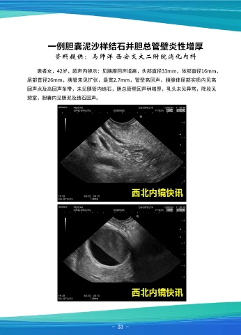 一例胆囊泥沙样结石并胆总管壁炎性增厚 资料提供:马师洋 西安交大二附院消化内科 患者女,42岁,超声内镜示:见胰腺回声增高,头部直径33mm,体部直径16mm, 尾部直径26mm,胰管未见扩张,最宽2.7mm,管壁高回声,胰腺体尾部实质内见高 回声点及高回声条带,未见胰管内结石,胆总管壁回声稍增厚,乳头未见异常,降段见 憩室,胆囊内见胆泥及结石回声。 - 32 - - 32 - - - 33 - 33 -