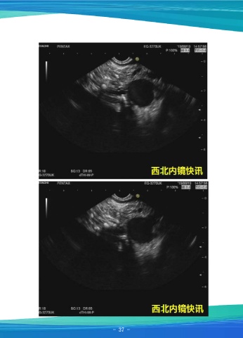 声,胰管下段可见一团块样高回声,截面大小4.3×2.5mm,远端胰管扩张,最宽处约