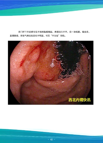 十二指肠球部胃黏膜异位 资料提供:唐都医院消化内科 樊晴伶 贲门环下方前壁可见不规则黏膜隆起,表面凹凸不平,见一溃疡面,覆白苔, 患者青年男性,胃镜见十二指肠球部多发颗粒样黏膜隆起,部分融合成片,表面微 显僵硬感,充吸气病灶处变化不明显,可见“平台征”阳性。 结构似田垄样,疑为幽门腺组织。 - 42 - - 42 - - - 43 - 43 -