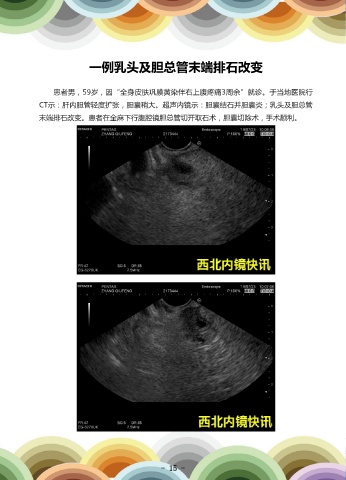 一例乳头及胆总管末端排石改变 患者男,59岁,因“全身皮肤巩膜黄染伴右上腹疼痛3周余”就诊。于当地医院行 CT示:肝内胆管轻度扩张,胆囊稍大。超声内镜示:胆囊结石并胆囊炎;乳头及胆总管 末端排石改变。患者在全麻下行腹腔镜胆总管切开取石术,胆囊切除术,手术顺利。 - 14 - - 15 -