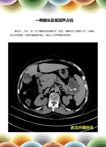 一例胰头区低回声占位 患者女,78岁,因“左下腹阵发性疼痛2月”就诊。胰腺平扫+增强CT示:1.胰尾 超声内镜检查:胰头区低回声占位FNA穿刺活检术。超声内镜病理提示:胰头穿刺 部占位性病变,粘液性囊腺癌可能。2.胰头上方异常强化团块影。 组织,示慢性肉芽肿性炎改变。 - 18 - - 19 -