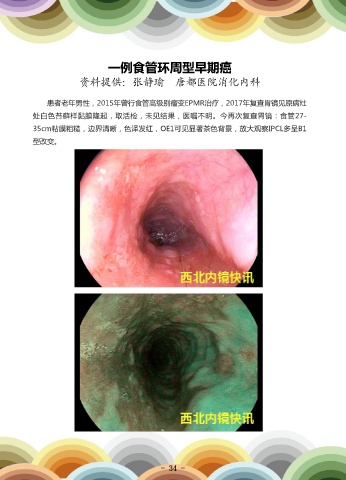 35cm粘膜粗糙,边界清晰,色泽发红,OE1可见显著茶色背景,放大观察IPCL多呈B1