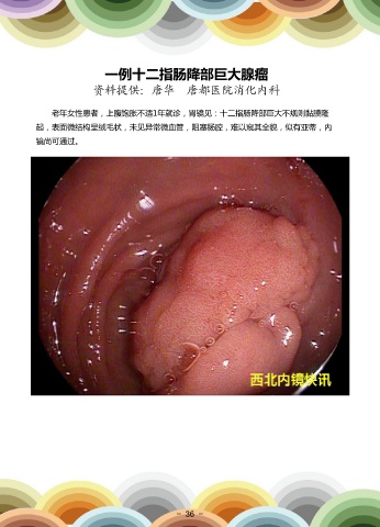 一例十二指肠降部巨大腺瘤 资料提供:唐华 唐都医院消化内科 老年女性患者,上腹饱胀不适1年就诊,胃镜见:十二指肠降部巨大不规则黏膜隆 起,表面微结构呈绒毛状,未见异常微血管,阻塞肠腔,难以窥其全貌,似有亚蒂,内 镜尚可通过。 - 36 - - 37 -