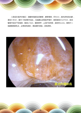 入院后行超声内镜示:胰腺体尾部实质萎缩,胰管增宽,约5mm,腔内多枚结石影,