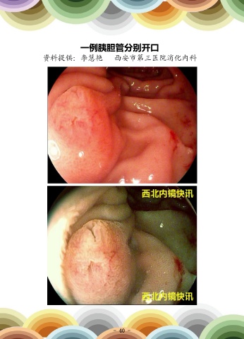 一例胰胆管分别开口 一例胰腺尾部假性囊肿内引流术 资料提供:李慧艳 西安市第三医院消化内科 资料提供:杨娟 西安市第三医院消化内科 患者男,43岁,以“发现胰尾部假性囊肿1月”之主诉入院。诊断慢性胰腺炎并胰 腺假性囊肿形成,遂行超声内镜下胰腺假性囊肿穿刺内引流术。 - 40 - - 41 -