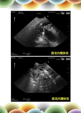 入院后行超声内镜示:胰腺体尾部实质萎缩,胰管增宽,约5mm,腔内多枚结石影, 直径3-8mm,最大一枚嵌顿于胰头,见胰腺头部低回声增大,截面直径31x27mm,胆总 管壁中段及下段增厚,最厚1.7mm,管腔狭窄,上段扩张明显,直径约1.2cm。换用十二 指肠镜观察乳头,正常结构消失,表面糜烂渗血,活检质软。 - 04 - - 05 -