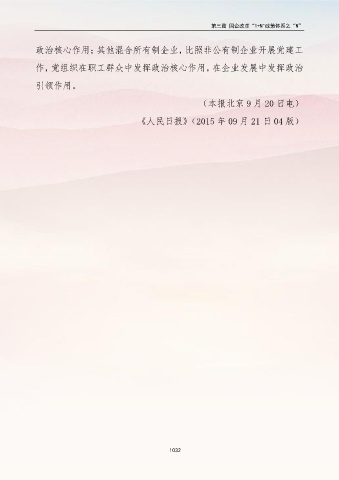 第三篇 国企改革“1+N"政策体系之“N” 政治核心作用;其他混合所有制企业,比照非公有制企业开展党建工 作,党组织在职工群众中发挥政治核心作用,在企业发展中发挥政治 引领作用。 (本报北京 9 月 20 日电) 《人民日报》(2015 年 09 月 21 日 04 版) 1032