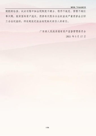 第四篇 广东省政策文件 期跟踪检查,试点过程中如出现制度不健全、程序不规范、管理不到位 等问题,致使国有资产流失、损害有关股东合法权益或严重侵害企业职 工合法权益的,将依规依纪依法追究相关责任人的责任。 广东省人民政府国有资产监督管理委员会 2021 年 5 月 17 日 1258