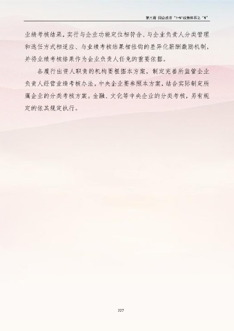 第三篇 国企改革“1+N"政策体系之“N” 业绩考核结果,实行与企业功能定位相符合、与企业负责人分类管理 和选任方式相适应、与业绩考核结果相挂钩的差异化薪酬激励机制, 并将业绩考核结果作为企业负责人任免的重要依据。 各履行出资人职责的机构要根据本方案,制定完善所监管企业 负责人经营业绩考核办法。中央企业要参照本方案,结合实际制定所 属企业的分类考核方案。金融、文化等中央企业的分类考核,另有规 定的依其规定执行。 227
