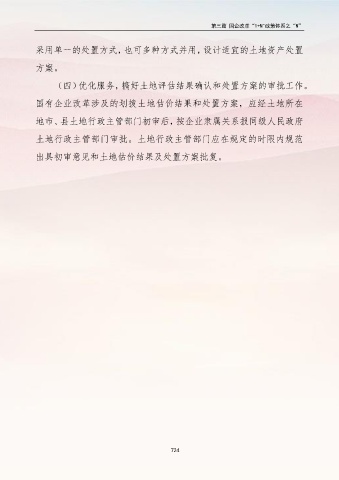 第三篇 国企改革“1+N"政策体系之“N” 采用单一的处置方式,也可多种方式并用,设计适宜的土地资产处置 方案。 (四)优化服务,搞好土地评估结果确认和处置方案的审批工作。 国有企业改革涉及的划拨土地估价结果和处置方案,应经土地所在 地市、县土地行政主管部门初审后,按企业隶属关系报同级人民政府 土地行政主管部门审批。土地行政主管部门应在规定的时限内规范 出具初审意见和土地估价结果及处置方案批复。 724