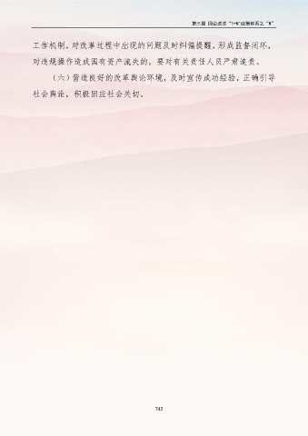 第三篇 国企改革“1+N"政策体系之“N” 工作机制,对改革过程中出现的问题及时纠偏提醒,形成监督闭环, 对违规操作造成国有资产流失的,要对有关责任人员严肃追责。 (六)营造良好的改革舆论环境,及时宣传成功经验,正确引导 社会舆论,积极回应社会关切。 742