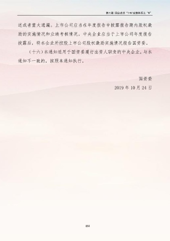 第三篇 国企改革“1+N"政策体系之“N” 述或者重大遗漏。上市公司应当在年度报告中披露报告期内股权激 励的实施情况和业绩考核情况。中央企业应当于上市公司年度报告 披露后,将本企业所控股上市公司股权激励实施情况报告国资委。 (十六)本通知适用于国资委履行出资人职责的中央企业,与本 通知不一致的,按照本通知执行。 国资委 2019 年 10 月 24 日 850
