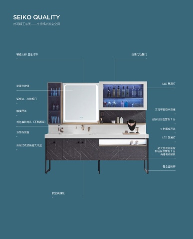 SEIKO QUALITY 席玛精工品质——享受精品浴室空间 099 智能 LED 三色灯带 百隆电动翻门 LED 氛围灯 防雾化妆镜 铝框边、灰玻柜门 五孔带盖防水插座 触摸开关 超长铝合金置物 T 台 枪色抽拉龙头(不粘指纹) 5 米感应开关 玉晶石面盆 LED 氛围灯 自吸式双层抽屉式拉蓝 超大型双层抽屉 带铝合金置物 T 台 百隆电动滑轨 铝合金柜脚 航空美纳板