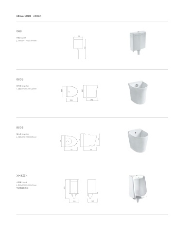 URINAL SERIES 小便器系列 175 068 350 水箱 Cistern L.350xW.120xH.355mm 740 8605 拖布池 Mop tub L.380xW.395xH.420mm 8606 拖布池 Mop tub L.430xW.370xH.395mm 430 395 370 430 430 XM8334 小便器 Urinal L.320xW.320xH.620mm 可做墙排和地排 620 320 320
