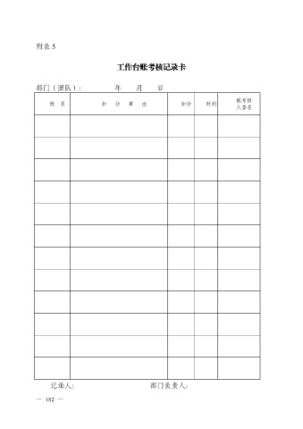 附表 5 工作台账考核记录卡 部门(团队): 年 月 日 被考核 姓 名 扣 分 事 由 扣分 时间 人签名 记录人: 部门负责人: — 182 —
