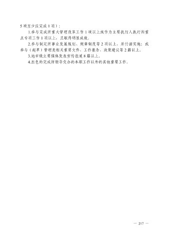 5 项至少应完成 1 项): 1.参与完成所重大管理改革工作 1 项以上或作为主要执行人执行所重 点专项工作 1 项以上,且取得明显成效。 2.参与制定所事业发展规划、规章制度等 2 项以上,并付诸实施;或 参与(起草)管理类相关重要文件、工作报告、政策建议等 2 篇以上。 3.地市级主要媒体发表宣传报道 8 篇以上。 4.出色的完成所领导交办的本职工作以外的其他重要工作。 — 217 —