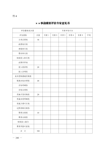 附 4 ××事前绩效评估专家意见书 评估指标及分值 专家评估计分 评估指标 分值 专家 1 专家 2 专家 3 专家 4 专家 5 平均 立项必要性 30 政策相关性 职能相关性 需求相关性 财政投入相关性 决策科学性 投入经济性 20 投入合理性 成本控制措施有效性 绩效目标合理性 20 目标明确性 目标合理性 实施方案有效性 20 实施内容明确性 实施方案可行性 过程控制有效性 筹资合规性 10 筹资合规性 财政投入能力 筹资风险可控性 合 计 100 — 240 —
