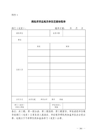 附件 1 湖北省省直机关单位差旅审批单 部门(处室): 填单日期: 年 月 日 前往单位 出差日期 事由 姓名 职务 出差人员 出行方式 公共交通 单位公车 租车 其他 部门(处室) 单位负责人 负责人审核 审批 备注:共三联,第一联公函,第二联报销,第三联留存。审批表经单位领 导或部门(处室)主要负责人签批后,单位领导带队的加盖单位办公室公 章,处级以下干部带队的加盖各部门(处室)公章。 — 301 —