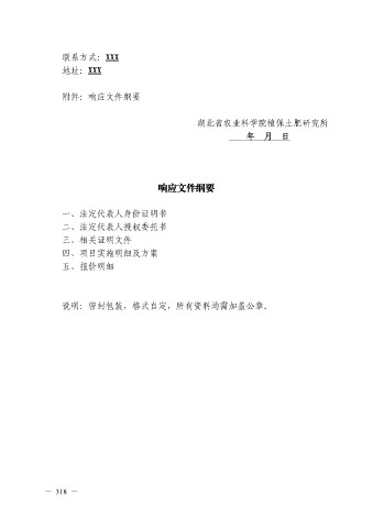 联系方式:XXX 地址:XXX 附件:响应文件纲要 湖北省农业科学院植保土肥研究所 年 月 日 响应文件纲要 一、法定代表人身份证明书 二、法定代表人授权委托书 三、相关证明文件 四、项目实施明细及方案 五、报价明细 说明:密封包装,格式自定,所有资料均需加盖公章。 — 318 —