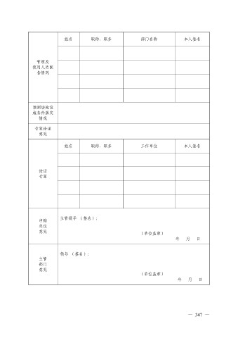 姓名 职称、职务 部门名称 本人签名 管理及 使用人员配 备情况 预测场地设 施条件落实 情况 专家论证 意见 姓名 职称、职务 工作单位 本人签名 论证 专家 主管领导 (签名): 申购 单位 意见 (单位盖章) 年 月 日 领导 (签名): 主管 部门 意见 (单位盖章) 年 月 日 — 347 —