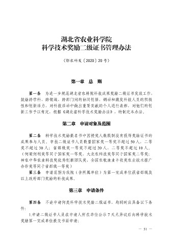 第一条 为进一步规范湖北省农科院科技成果奖励二级证书发放工作,