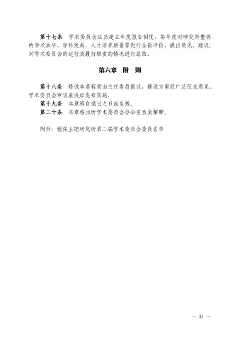 第十七条 学术委员会应当建立年度报告制度,每年度对研究所整体 的学术水平、学科发展、人才培养质量等进行全面评价,提出意见、建议; 对学术委员会的运行及履行职责的情况进行总结。 第六章 附 则 第十八条 修改本章程须由主任委员提议,修改方案经广泛征求意见、 学术委员会审议表决后发布实施。 第十九条 本章程自通过之日起生效。 第二十条 本章程由所学术委员会办公室负责解释。 附件:植保土肥研究所第二届学术委员会委员名单 — 81 —